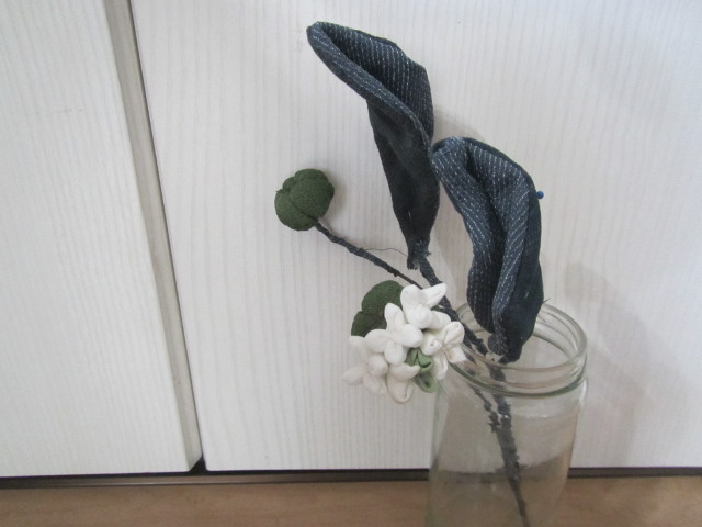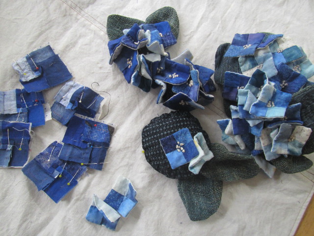 ブルー系のハギレの中から探し、2cmの四角繋ぎ。 1本の花をバラバラにし、混ぜ込み2本追加。 ペレット&綿を入れた土台に縫い付け。 (昨年は、くくり花でアナベルを作りました。左) 今年はアナベルをドライフラワーに挑戦 トールペイントは妹の作品
