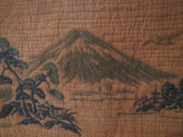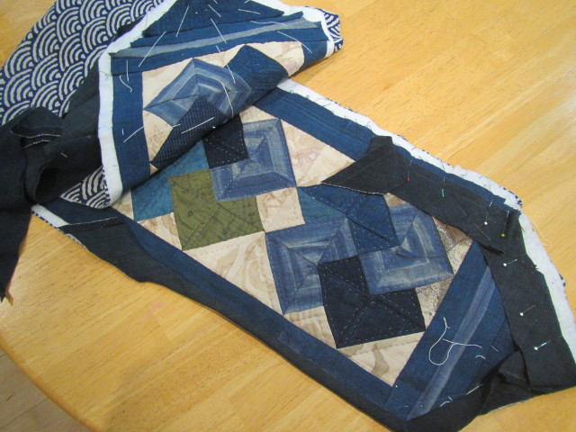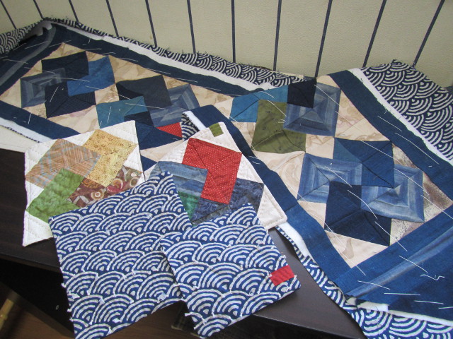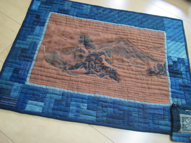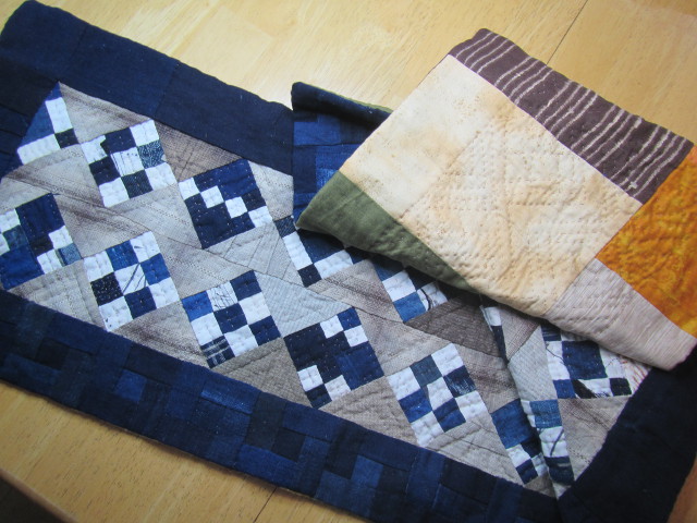 柿渋で染めた手ぬぐい ボーダーは無地の藍のハギレで8cmのログキャビン 中心は2x2cm 中心部分は、落としキルト。 完成 48x64cm |