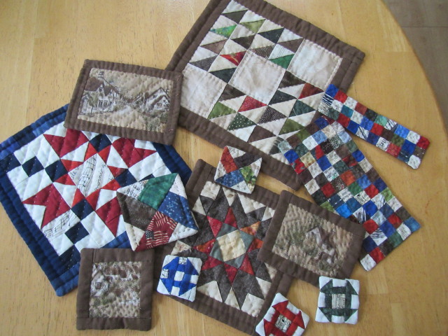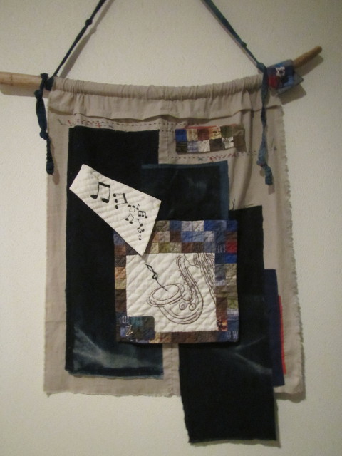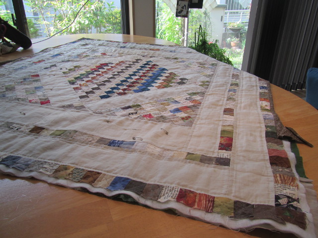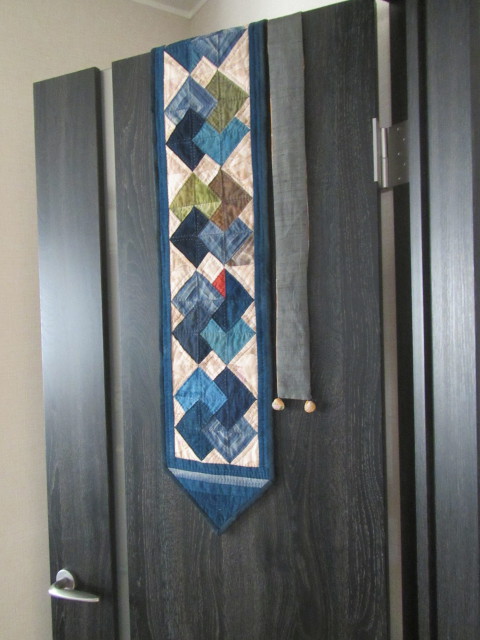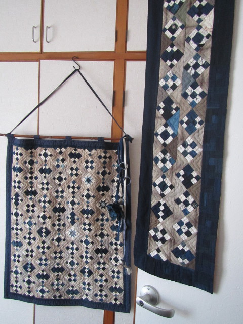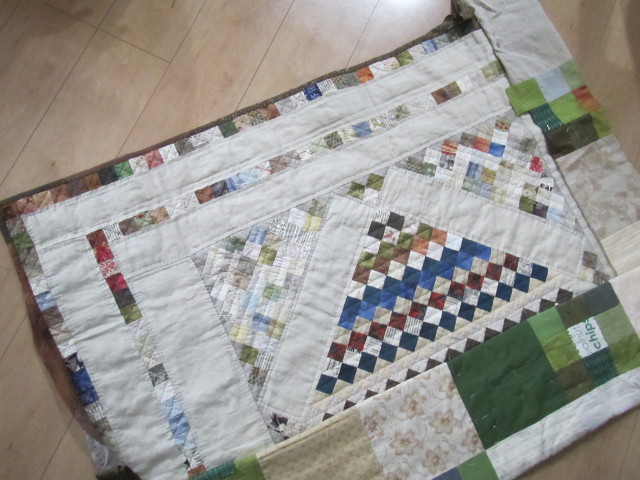 壁掛けとペアで縦長のキルトを予定していました。 壁掛けだけで満足(85x70cm)・・・ 布整理で途中パターンが出てきました。 再開・・・ 6cmの4種類のパターンを2列(33枚・三角2枚) 部屋の床に出来上がったパターンを並べ、茶系の布をカット。 パターン作りが終わり、茶系布の配置変更・・・ 様子を見に部屋を覗くのも気分転換になりました。 ボーダー 5cm 146x26cm完成 裏は、古布。 傷んでいる部分の補修作業をし、袋仕立て