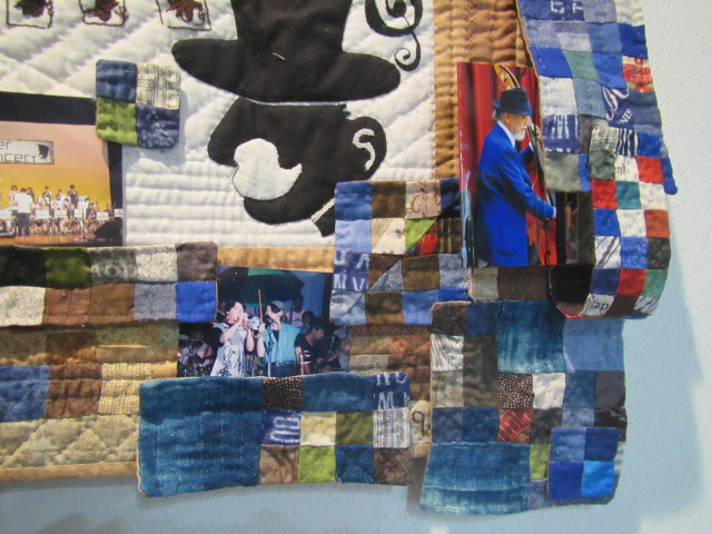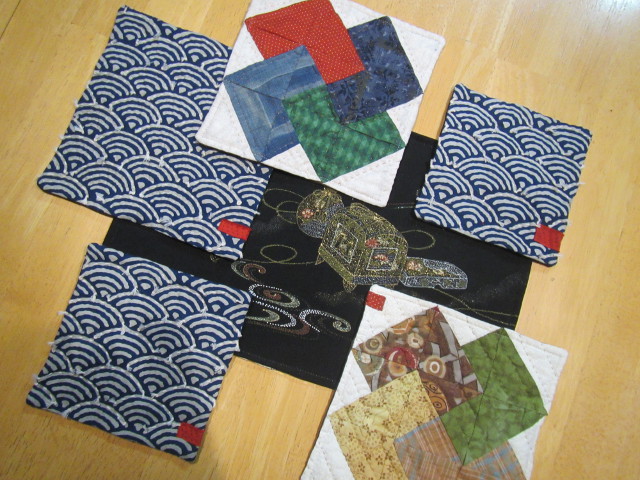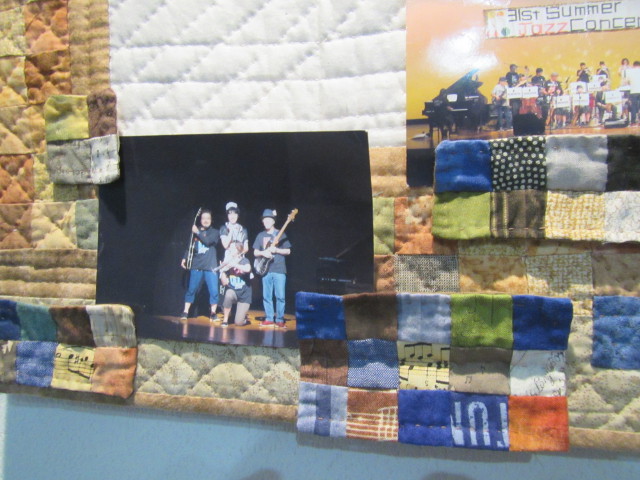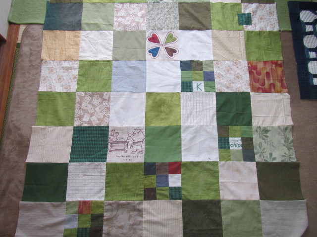 顧問の先生のお子さんが書いてくれた絵の刺繍キルトに袋とじをした四角繋ぎを配置。