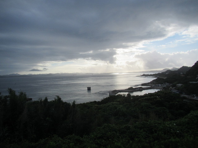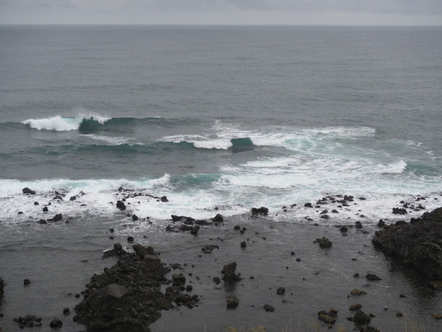 夕日をみながら海岸の岩場にある露天風呂が有名 雨は止んでいましたが・・・ 引き潮で半減 湯あみ着を着用なっていました。 |