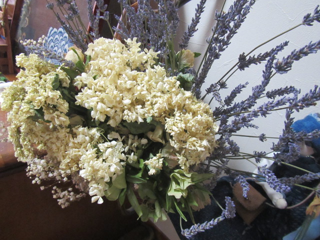 庭で楽しませて貰った花をドライフラワーにしてみました。 紫陽花(アナベル)・カスミソウ・ラベンダー・クリスマスローズ |