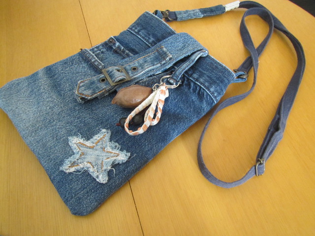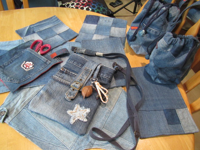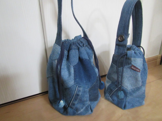 頂いた6本のジーンズ まず、解体作業から・・・ 巾着は六角形繋ぎ・・・ ポケット部分を利用してショルダーバック・・・ 遊ばせて貰いました。 ハギレの選別