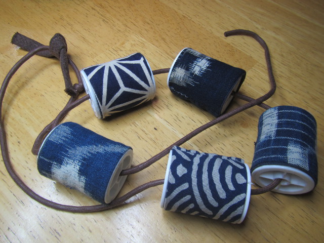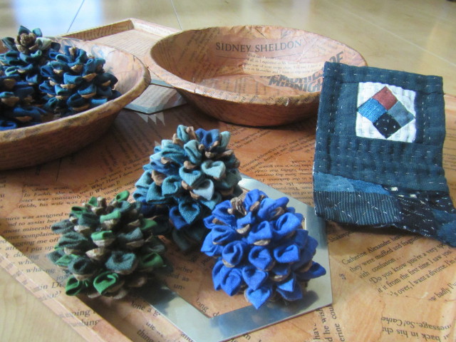 クリスマスのリース作りに頂いた松ぼっくりと正方形3cmと4cmの藍の屑布処分・・・ 気分転換に、少しずつ内職?嵌ればスピードUP クリップを大・中を使い、携帯スタンド 8x17cmのミニキルトを作り、クリップのカバー |