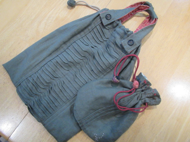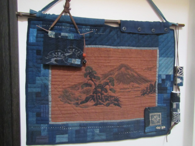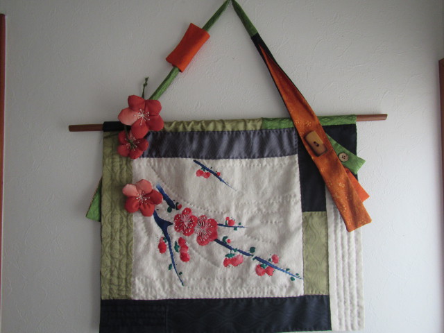 一閑張りに貼り付ける予定で着物のハギレを購入したのですが、壁掛けに・・・ アクセントに、縮緬細工の梅の花を飾ってみました。 布は、着物の裏(袖口・裾部分) 1個は口べりを付けて小袋に・・・ 完成 34x42cm |