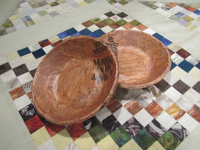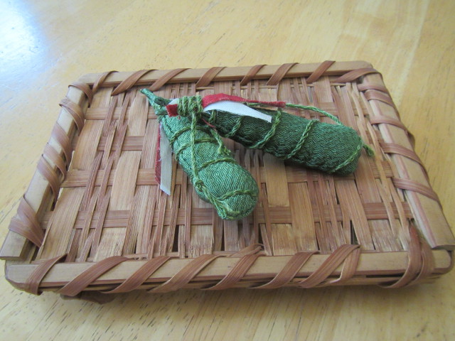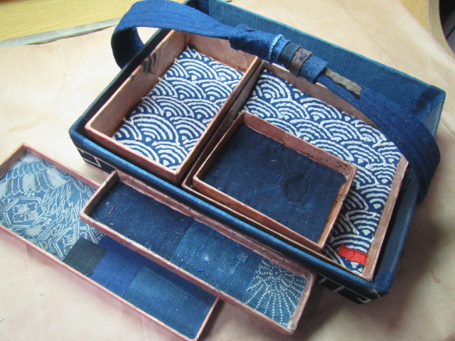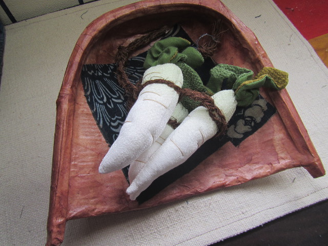 一閑張り初めての作品をリメイク 籠の中央7x28cm部分のみ和紙を貼り付け、その上に古布を貼り付けた作品(秋の古民家) バックに・・・ |