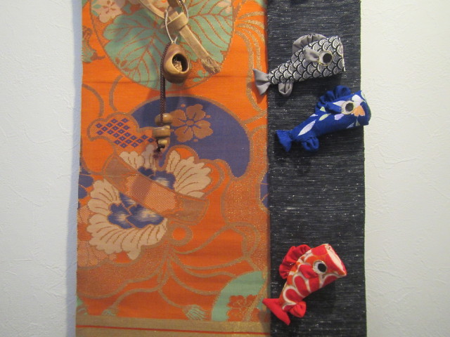 完成した鯉を帯に飾り付け・・・