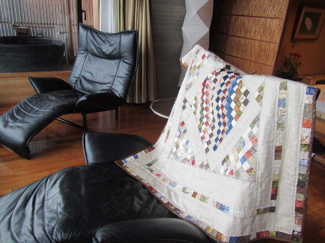 【ONE PATCH メダリオンキルト】 スクラップキルトです。 なつかしいハギレ達、布見本のよう・・・ 中心からキルティング・・・ 外に向かって追いかけキルティングをし、1cmのパイピング。 型紙は正方形3cm 中心部分 208枚 角168枚 まとめて製図をすると、イヤになってしまうので縫い合わせながら・・・ (3cmの正方形、計658枚カット) 完成 126x114cm。(山形 いさごやにて撮影) 車での移動時間が長いので、とても役に立ちました。 |