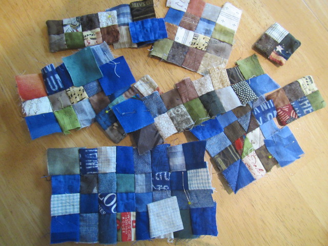 裏布は布整理を兼ね、ミシンで正方形18cmの四角繋ぎ
