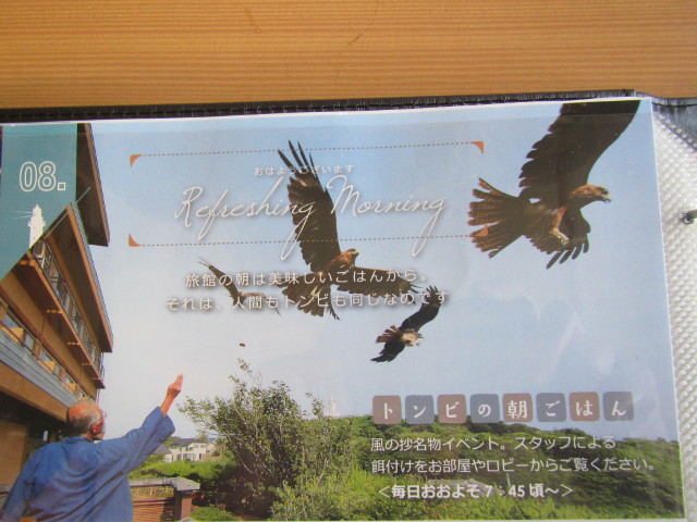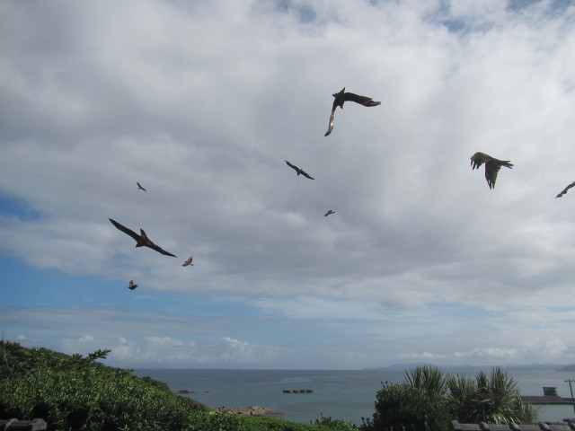 弱っていたトンビの親子を助けた事がきっかけで始まったそうです。時間になり、白いタオルを振り呼びかけるとたくさんのトンビが集まってきました。料理に使った魚のアラをスタッフがほうり投げるとナイスキャッチ。迫力満点。 私が撮った写真は、空ばかり・・・ 途中からあきらめ トンビの朝ごはんを楽しんできました。 (7/17)
