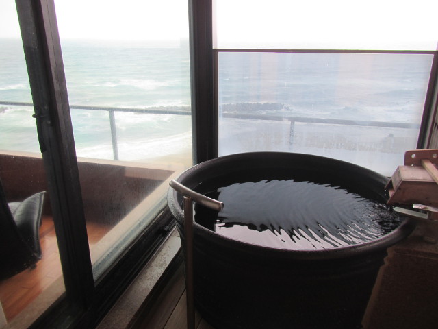 朝日をみながら露天風呂・・・最高でしょうね。 自宅から1時間半なので毎年出かけていますが、残念ながら雨女のようです。 サウナで汗を流し低温泉に・・・ 湯船から流れ落ちる音が気持ちが良い・・・ 経験したかった・・・満足! 風力発電の数が増えていました。