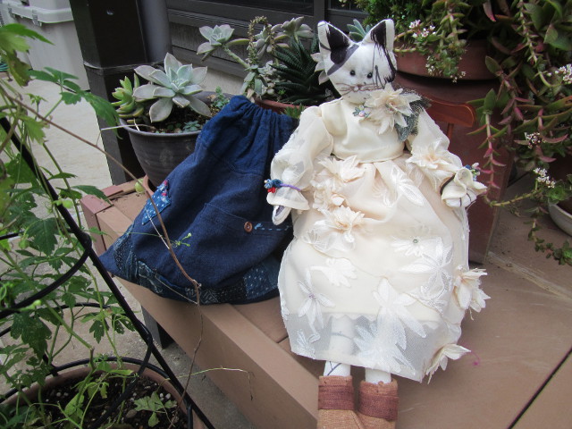 どこに出かけるのかな? 孫のワンピースをカットし、人形に新しい洋服を・・・ 履いていたスカートは布を補充し、29x25cmの巾着 タック模様のワンピースを張り切って作ったのはいいが、眠ったまま・・・ |