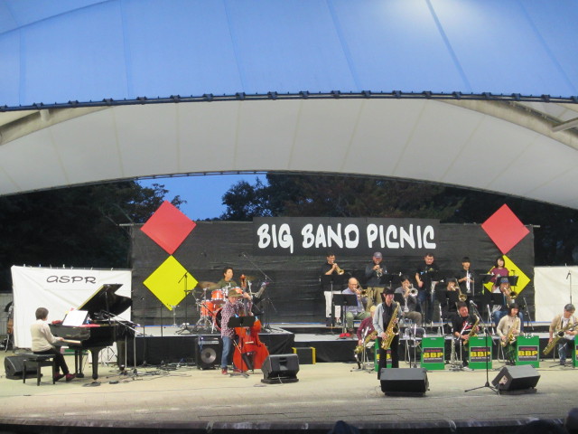 日程と曲を決めて演奏者を公募の1日限りのジャズバンド 合同練習2回のみ・・・ どんな音色になるのか不安でしたが、各バンドで活躍している人達さすがです。 猛暑の為、木陰に椅子を移動させ聴きました。 お疲れ様でした。(9/16)