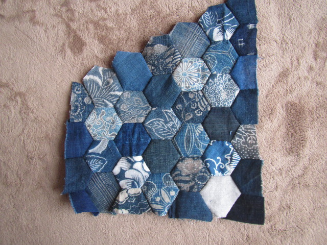 知人が骨董市で手作り作品を販売しています。 月1回、ウォーキングを兼ねて宝探しに・・・ 型染めのハギレをみつけました。 ワクワク・・・(5/28) 布整理を兼ねて少しずつカットし、並べ替えてイメージ作り・・・ 1辺が2・8cmの六角形 138枚 幅 24cmx128cm ドアに掛けて楽しむ? 骨董市でみつけたフクロウのキーホルダー&ソロバンの玉&帯締めで飾り付け |