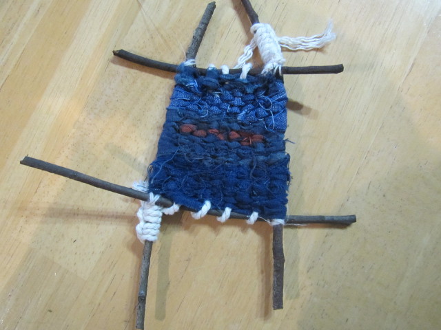 近くの公園で小枝探し・・・ 小枝が織り機? 枝がクロスした部分(4箇所)を紐で結ぶ たて糸を7回巻き、横糸(裂き布1cm幅)を通す フォークで横糸を打ち込むと便利 面白くなり、小枝探しに公園に出かけたが・・・ 綺麗・・・ ちょっと曲がった枝が面白い形に・・・ |