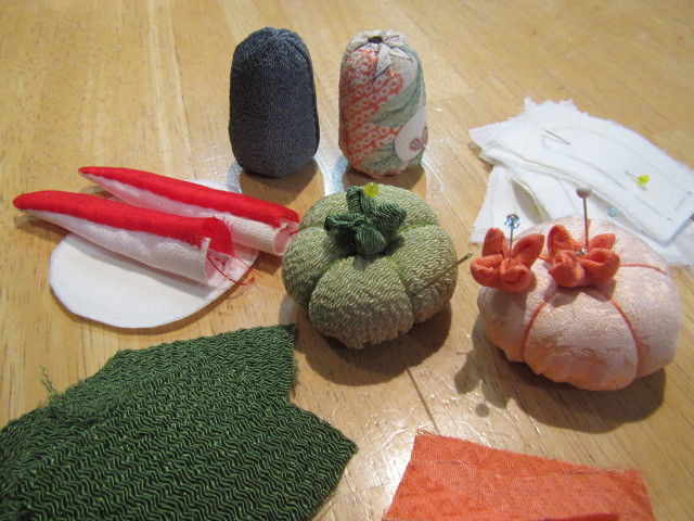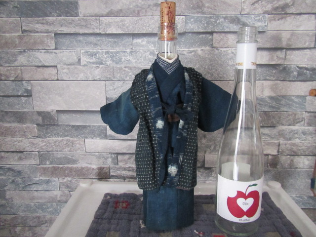 娘が旅先で『ワインボトルに着物を着せて飾ってあったのを観たよ。 残念ながら非売品だった。』 縮緬細工のお店で、話がはずんだ様子。 大根・干し柿の縮緬細工をお土産に・・・ お正月、蜂蜜入りワインをお土産に・・・ ボディー材料 飾っていた着物が部分色焼け・・・(右側のみむら染め風) 後日、娘に確認。 似た大きさのワインをみつけ、残るはコルクの蓋・・・ |