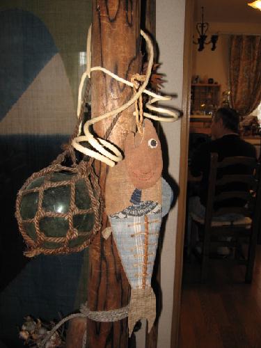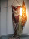 稲 ・粟 ・ガマの穂を織り込んだ壁掛け 酒袋で作った干し柿・シャケ 錆びれた色が何ともいえません。 |