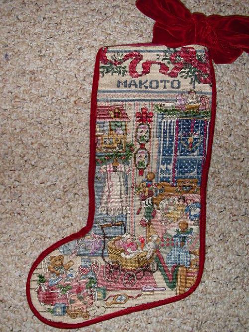 とても気に入りつい買ってしまったというクロスステッチの靴下。 夢がありますね。 素晴らしい作品です。(1足 150$) 3足目は本を購入し制作中・・・ |