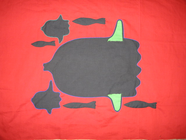 原色の赤・青・黄・オレンジなどの布を重ね、切り抜いては、たてまつりで縫い止めて、模様を描き出していく逆アップリケのような手芸。