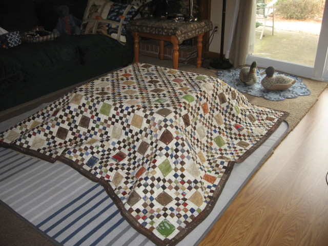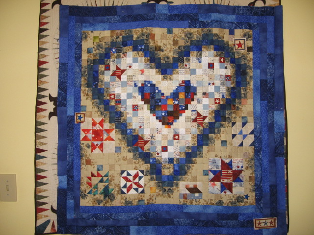 素敵な出逢いに感謝! 知人が友達から頂いた作品を見せて貰い感激!! 作って見たい・・・ 大切な作品なので、1日だけ借りて模写してみました。 カーボン紙をセロテープで貼り合わせ模写。 窓にカーボン紙に模写した図案をテープで貼り、今度はコピー用紙に写し型紙作り・・・満足!完成した気分。 着物はちりめんのミニ風呂敷&知人から頂いたちりめんの巾着など・・・ ボーダーは帰省した時に古着屋さんで買ってきた大島紬。 ラインをアップリケしアクセントを付けてみました。 キルト綿・裏・表を重ね毛抜き仕立て。 裏布はモラで使った残り布の繋ぎ合わせ・・・ 完成 110x128cm |